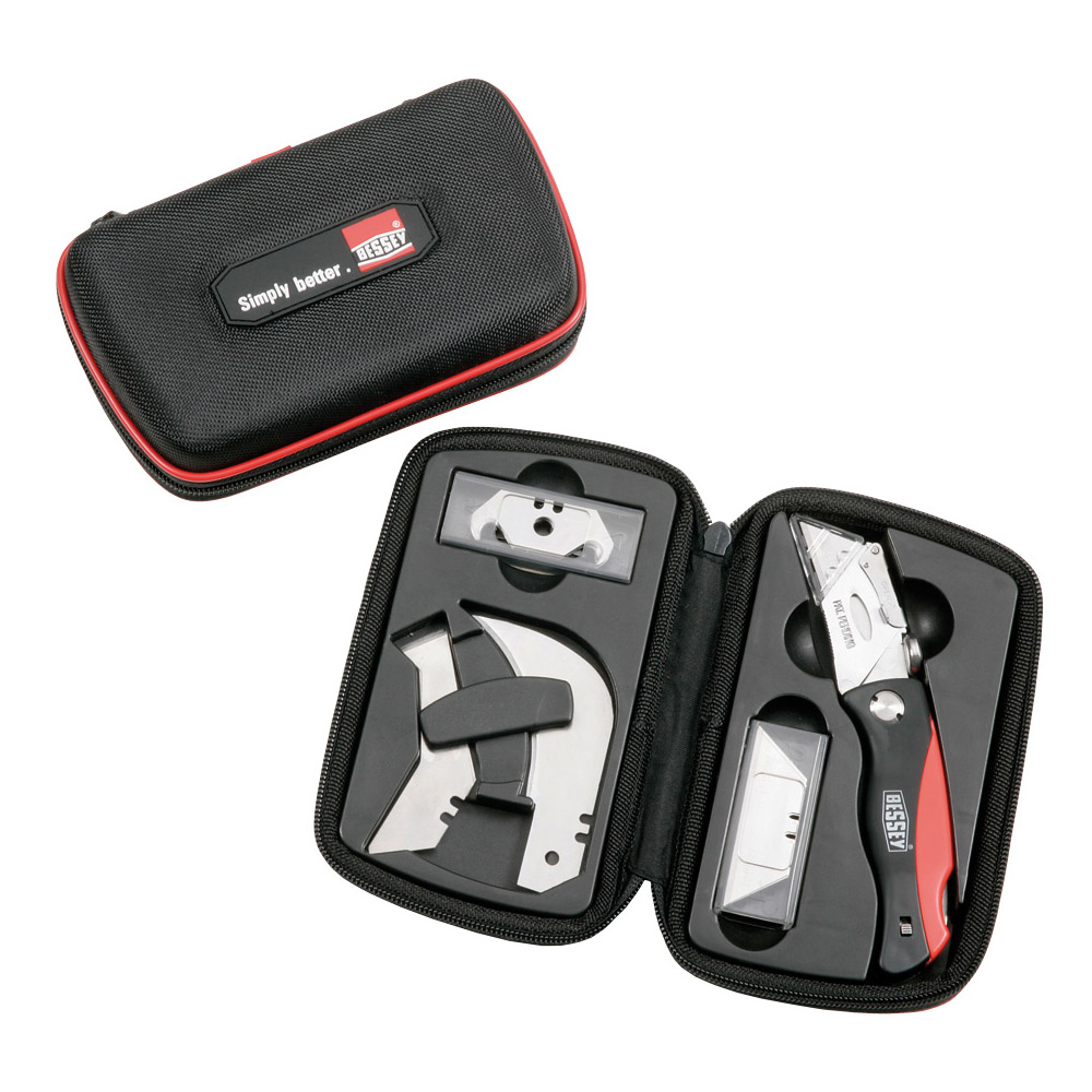 Set Inhalt: DBKPH Klingen-Klappmesser in praktischer Tasche aus Nylon, 15 Stück Trapezklingen DBK-T, 5 Stück Hakenklingen DBK-H, 2 Stück Linoleumklingen DBK-L, 2 Stück Ausstechklingen DBK-A.