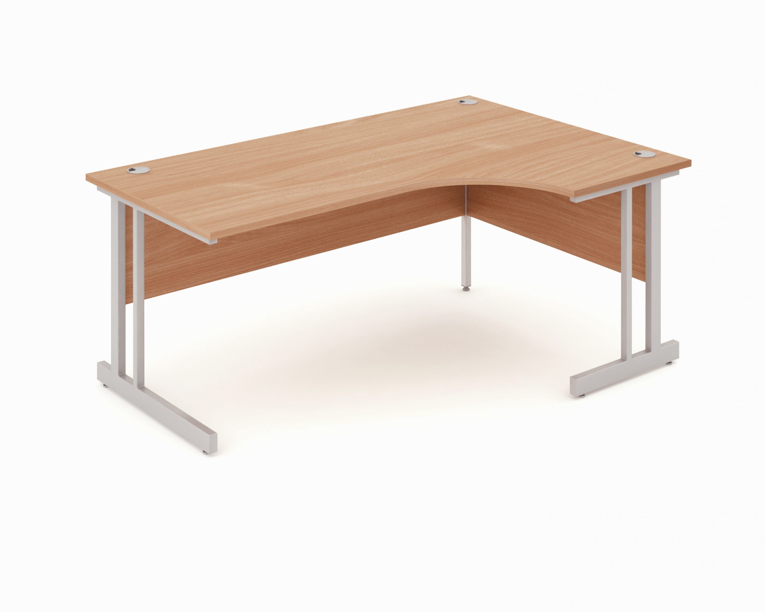 Schreibtisch mit Metalluntergestell und geschwungener Tischplatte.