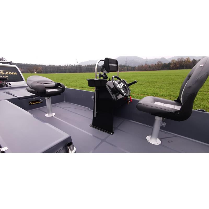 Zur Standardausrüstung gehören 3 Edelstahl Schleppösen; 4 x PVC Belegklampen; aufgebaute Edelstahl Bugrolle; rutschfeste Lauffläche; Gummischeuerleiste rund um den Bootsumfang; abnehmbare Mittelsitzbank; und frei wählbare Standartfarben – Weiß RAL 9010, Lichtgrau RAL 7035, Signalgrau 7004, Betongrau RAL 7023, Schiefergrau 7015, Grün RAL 6028, Blau RAL 5002 und Braun RAL 7008. Um ein erstklassiges Design zu bekommen, empfehlen wir den Metallgraphitzuschlag, sowie für langfristiges Arbeitsersparnis Antifouling. “Ebenso können wir Ihnen das “Elektrische Set” anbieten welches eine vollautomatische Bilgepumpe, ein eingebautes Schaltpaneel, 360 Grad weißes Rund um Licht mit Schnellverschluss und auf Option noch LED Lichter enthält. Sie müssen also nur noch eine Batterie anschließen und brauchen sich keine Sorgen über Regenwasser machen!