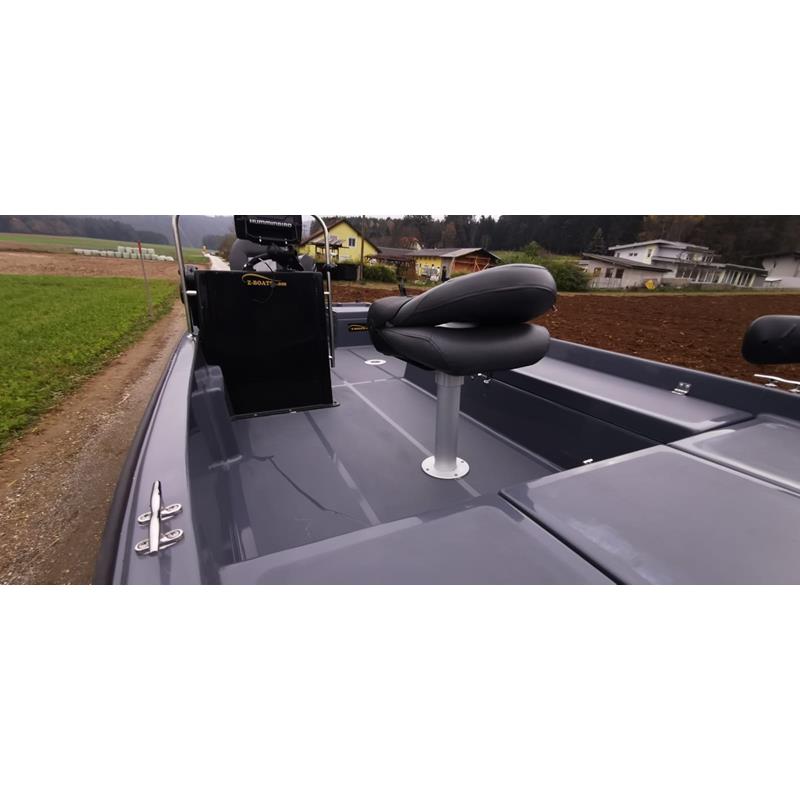 In der tief-konstruierte Pumpensumpfaussparung zwischen den beiden Heckstaufächer kann eine Bilgepumpe Ihr Boot auch bei starkem Regen sicher trocken halten und ist sehr praktisch wen man mal das Boot nicht abgedeckt hat, da es sich dadurch vollkommen entwässert. Die rechteckige Fläche neben dem länglichen Staufach bietet sich ideal an, um ganz leicht eine Liegefläche einzulegen um so z.B Bootsangeln für mehrere Tage zu ermögliche und das, ohne eine einzige Befestigung ins Boot zu montieren! Weiteres kann diese Liegefläche auch mit Polsterungen ausgestattet werden, um sich darunter enorm viel Staufach zu erschaffen, aber vor allem um ein komfortables Sonnendeck mit Polsterungen, oder ein Spinncastdeck mit Drehstühle zu erschaffen. Ausgerüstet mit moderner Edelstahl – Reling, Sonnendeck und Polsterung wird dieses Boot die unschlagbare Kombination im Bereich Angel/Freizeit/Badeboot!