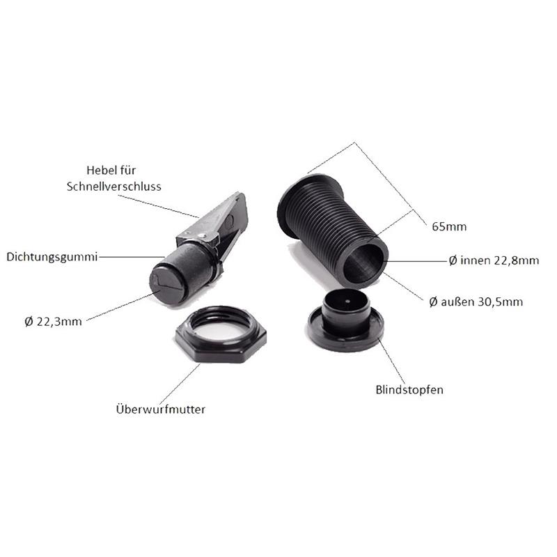 Lenzstopfenset bestehend aus: 1x Durchführung, Durchführung passt für fast alle Lenzstopfen. Durchgängiges Gewinde mit Überwurfmutter, kann auf eine beliebige Länge eingekürzt werden. 1x Blindstopfen, 1x Lenzstopfen mit Schnellverschluss (einfach Hebel umlegen, abgedichtet)