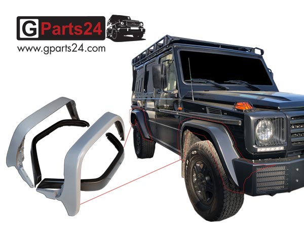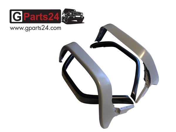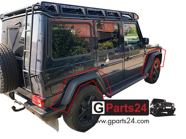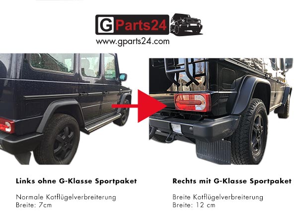Mit dem Original Mercedes G-Klasse Komplettset von GParts24 verwandeln Sie Ihren „Würfel“ ab Baujahr 1989 optisch in ein Facelift-Modell. Die älteren Modelle wurden damals bis Baujahr 2014 mit normal-breiten 7 cm Kotflügelverbreiterungen ausgeliefert. Nur der G55 hatte die ersten breiten Kotflügelverbreiterungen. Diese G-Klasse Kotflügelverbreiterung wurde noch bis zur Einführung der Plastikstoßstange verbaut und waren auch nur bei der Bestellung des Sportpaketes erhältlich.