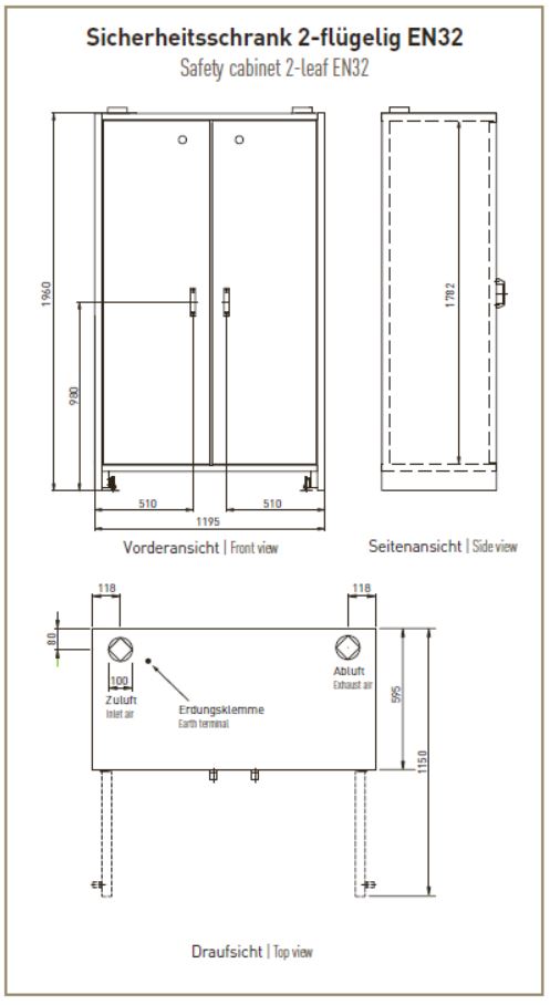 - Im Brandfall selbstschließende Be- und Entlüftungsöffnungen auf der Schrankoberseite, Anschlüsse DN 100 mm