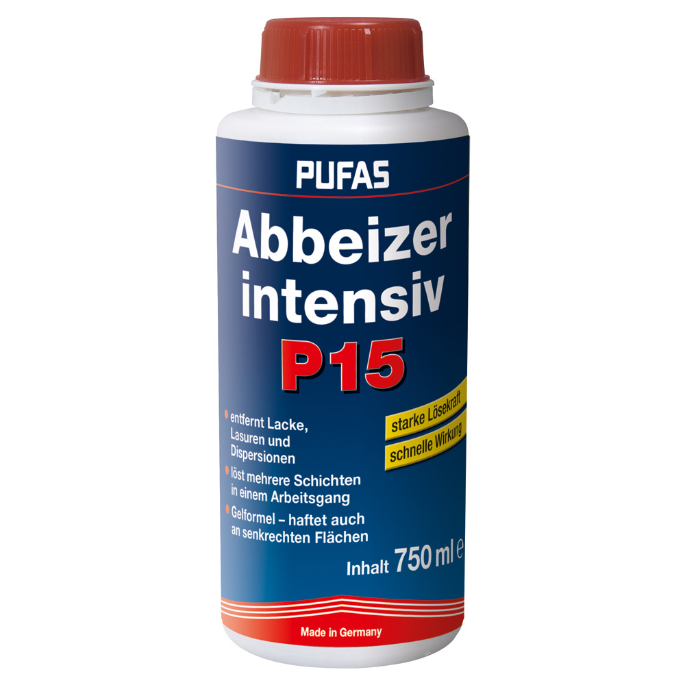 Abbeizer P15 intensiv entfernt schnell und kraftvoll Kunstharz- und Acryllacke, Ölfarbenanstriche, Lasuren, Dispersions- und Latexfarben und ähnliche Beschichtungen.