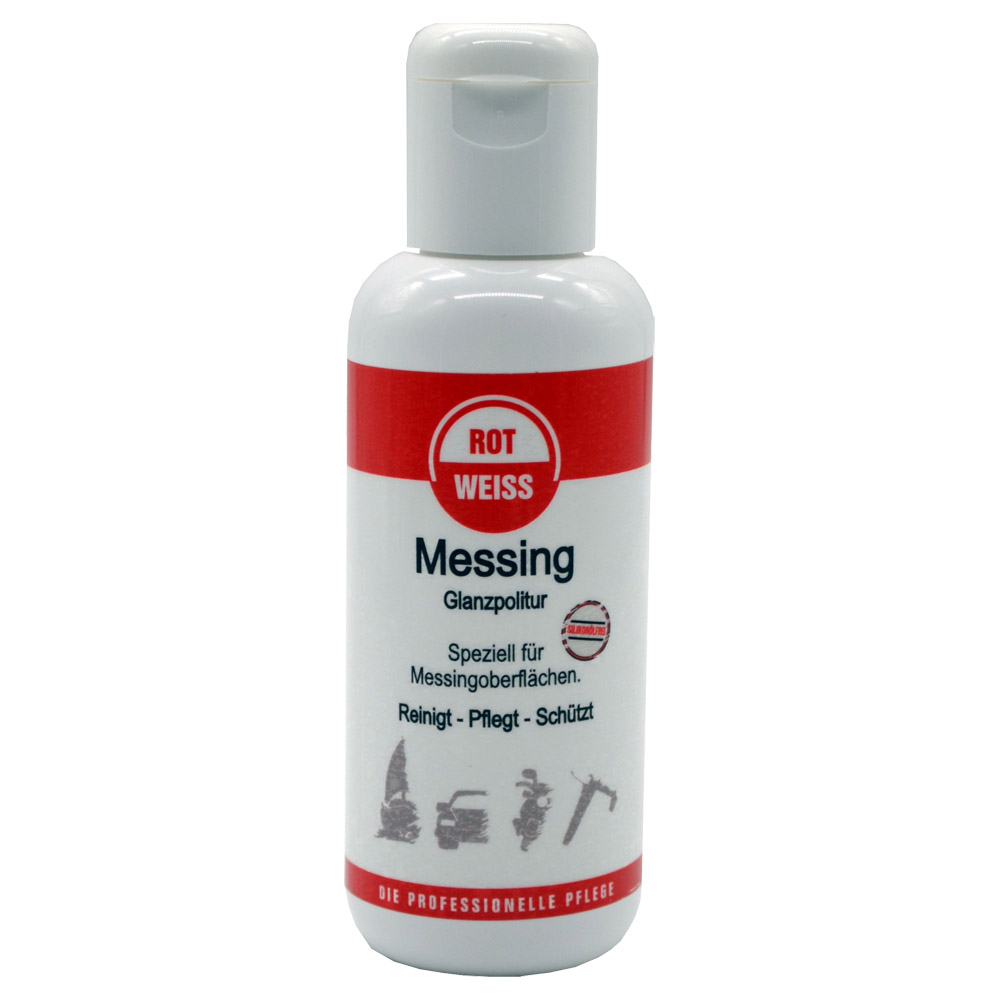 ROTWEISS Messing Glanzpolitur. Speziell für hochglanzpolierte Messingoberfläche. Reinigt, pflegt und schützt inkl. Oxydationsschutz. Silikonfrei. 150 ml.