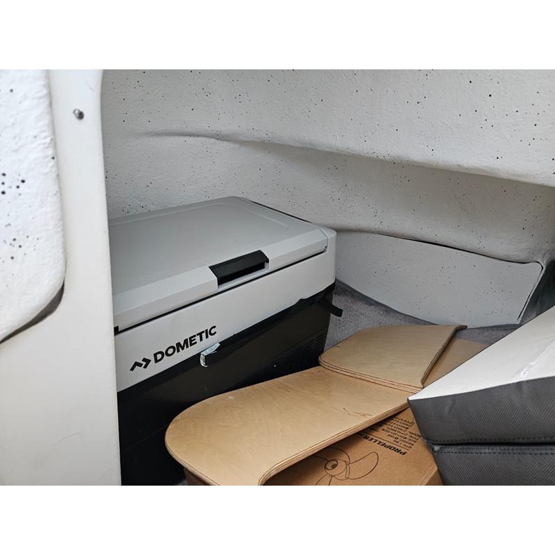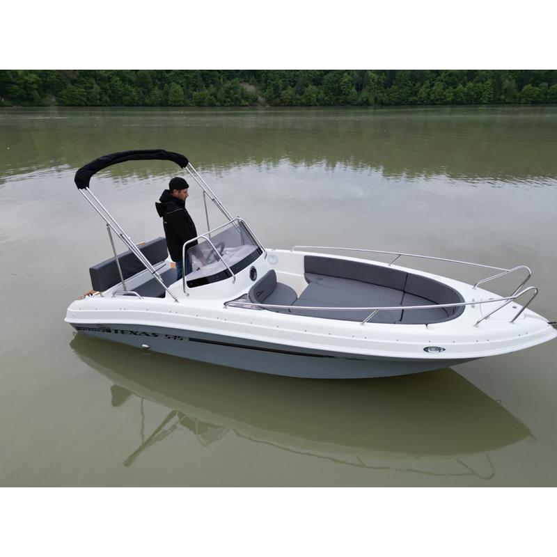 Es biete reichlich Stauraum und schafft enorm viel Platz, sodass nichts im Wege liegt und die Optik immer und zu jederzeit stimmt. Die moderne Steuerkonsole bietet ein traumhaftes Fahrverhalten und Feeling und ist mit einer modernen Edelstahl – Reling und Windschutzscheibe ausgestattet. An der Konsole können dank Ihrer Konstruktion viele weiter Features installiert werden. Darunter befindet sich ein sehr großer und langer Stauraum in dem man ein Chemie-WC, Polsterungen, Bimini, und viele weitere Utensilien verstauen kann aber genauso biete dies den optimalen Platz für den Einbau von einem Kühlschrank das viele unserer Kunden bevorzugen.