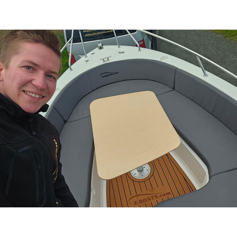Die groß angelegte Liegefläche bietet mit Ihren Polsterungen angenehmen Komfort, ist leicht zugänglich und ist schön groß und offen angelegt. Wollen Sie mit Ihrer Crew etwas trinken, oder ein Morgenfrühstück genießen, so lässt sich ganz easy die Liegefläche mit einem Tischbein und eingebauter Konsole am Boden ein Tisch in der Sitzgruppe anlegen. Getränkehalter und angenehme Rückenpolster sorgen für weitere tolle Features. Eine PVC – Scheuerleiste biete dem Boot Schutz bei Steg- und Hafenanlagen und ist aus wieder standfähigem Material gefertigt.