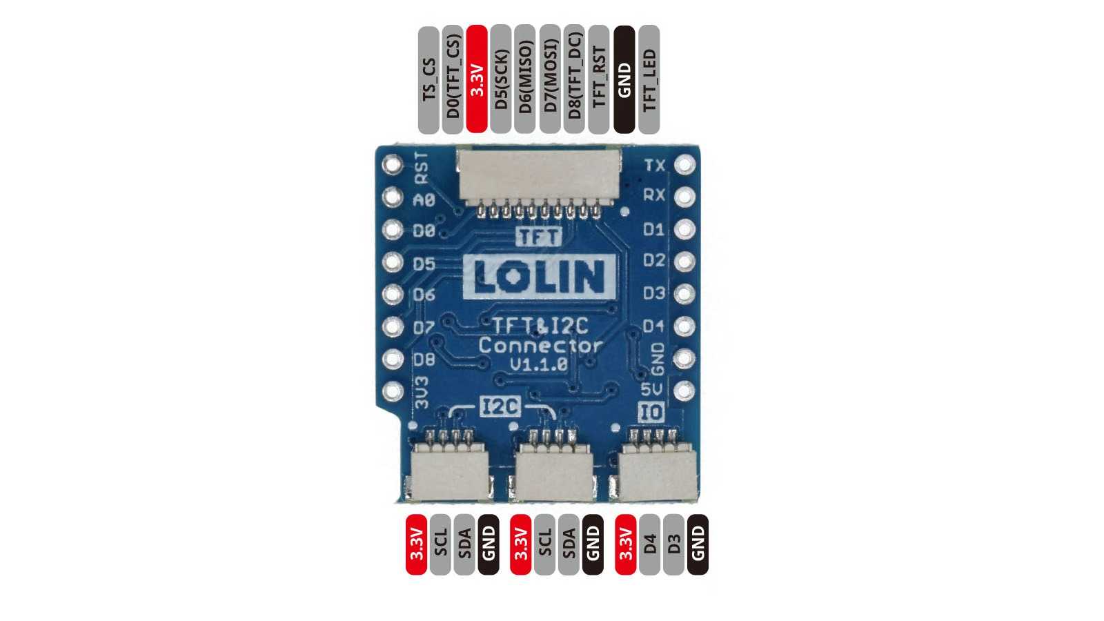 Mit diesem Erweiterungs-Shield kannst Du Dein WeMos Board um zwei weitere I2C Schnittstellen und einer TFT-Schnittstelle erweitern.